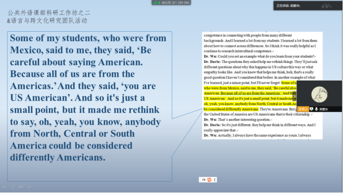 吴爱华博士的发言结束后,参加工作坊的老师们纷纷提出自己的问题参与讨论。外国语学院院长曹曼教授最后点评认为,吴爱华博士这次难得的访学经历给老师们很大的启发,希望大家能结合这次分享中的收获积极投入到英语教学改革研究和实践中,切实提高我院教师的跨文化能力,并能为学生提供前沿的跨文化知识。提升自身素养的同时,提高学生的语言能力和跨文化意识,充分发挥英语人文性和工具性的双重特性,实践“全人发展”的教育理念。