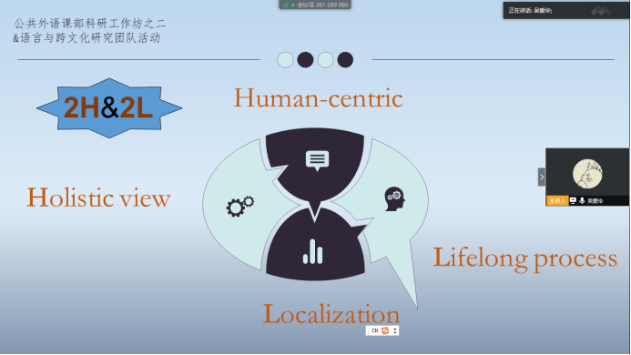 最后,吴爱华博士重点分享了在跨文化研究中的原则。她认为,在跨文化研究中要遵循“2H2L”的原则,即整体观(Holistic view),以人为中心(Human-centric),本地化(Localization),终身化(Lifelong process)。