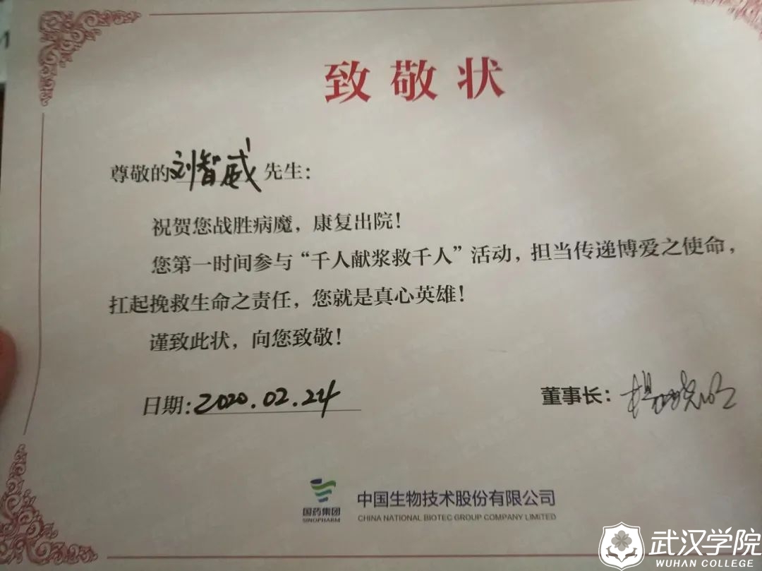 回顾过去一个多月的“战疫”经历,刘智威的内心更多是感恩,感恩一直陪伴关心自己的亲人、朋友们,感恩辅导员张紫薇老师在他住院期间每天的问候和鼓励,感恩校党委送来的慰问信与慰问金,感恩医护人员日复一日的救治与坚守。