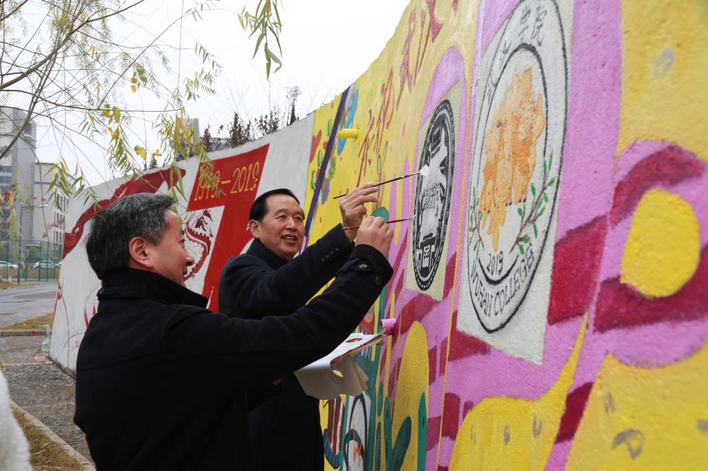 △李忠云校长、陈祖亮书记和学生共同绘制“志墙”