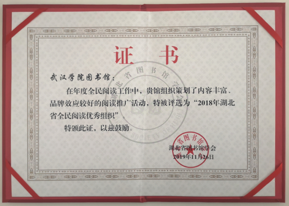 12月3日,湖北省图书馆学会公布了《2018年全民阅读相关称号的决定》。PG电子图书馆荣获“2018年全民阅读优秀组织”称号,而且是在本次评选中获得此项荣誉称号的两所民办高校图书馆之一。