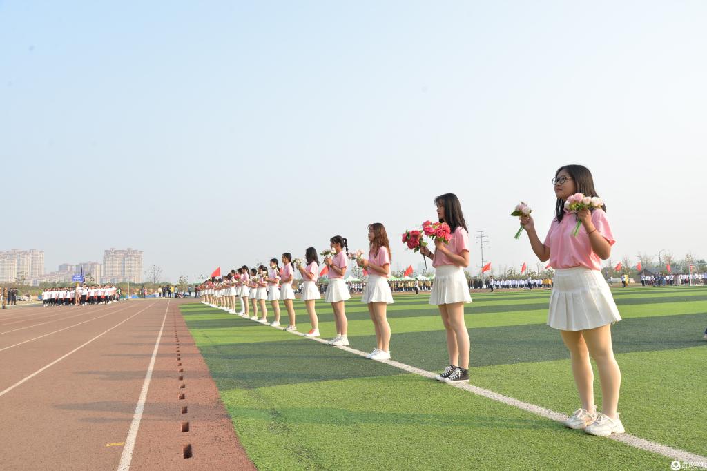 男生组成的红旗方阵、女生组成的鲜花方阵、裁判员方阵在校广播台播音员的激情解说下一一入场。
