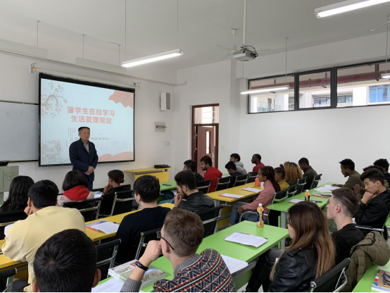 随后,国际交流与教育学院院长卢江滨教授给全体留学生进一步强调了在校努力学习的重要性,希望大家要学会珍惜和利用好大学学习的美好时光,不给自己留下遗憾,为将来的人生努力奋斗。