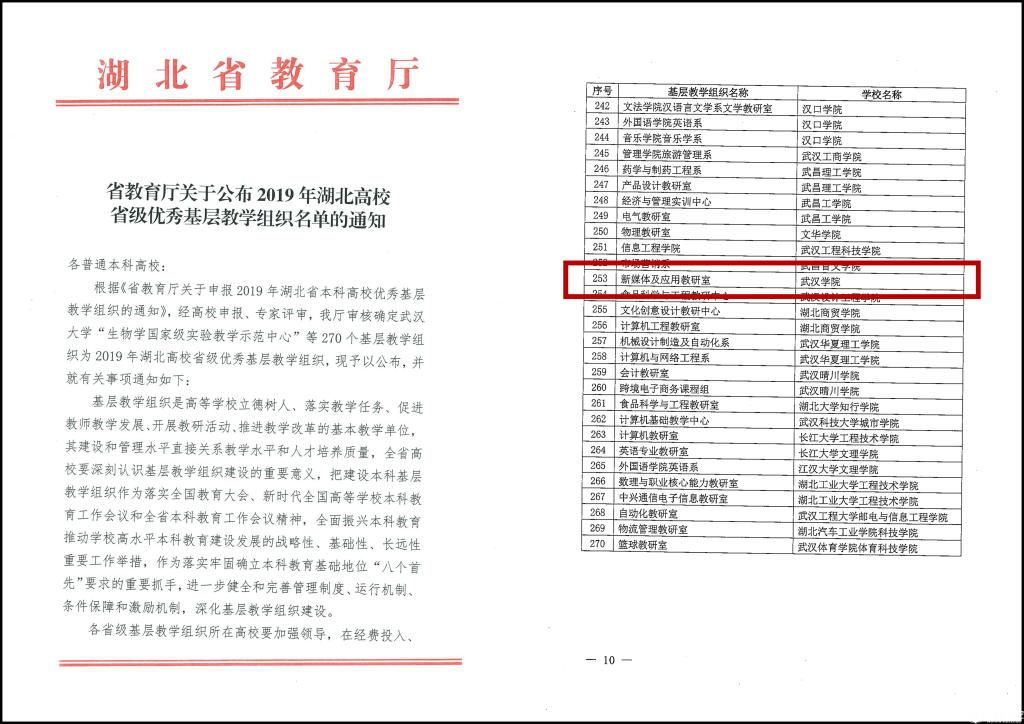 图2 新媒体及应用教研室获评2019年省级优秀基层教学组织