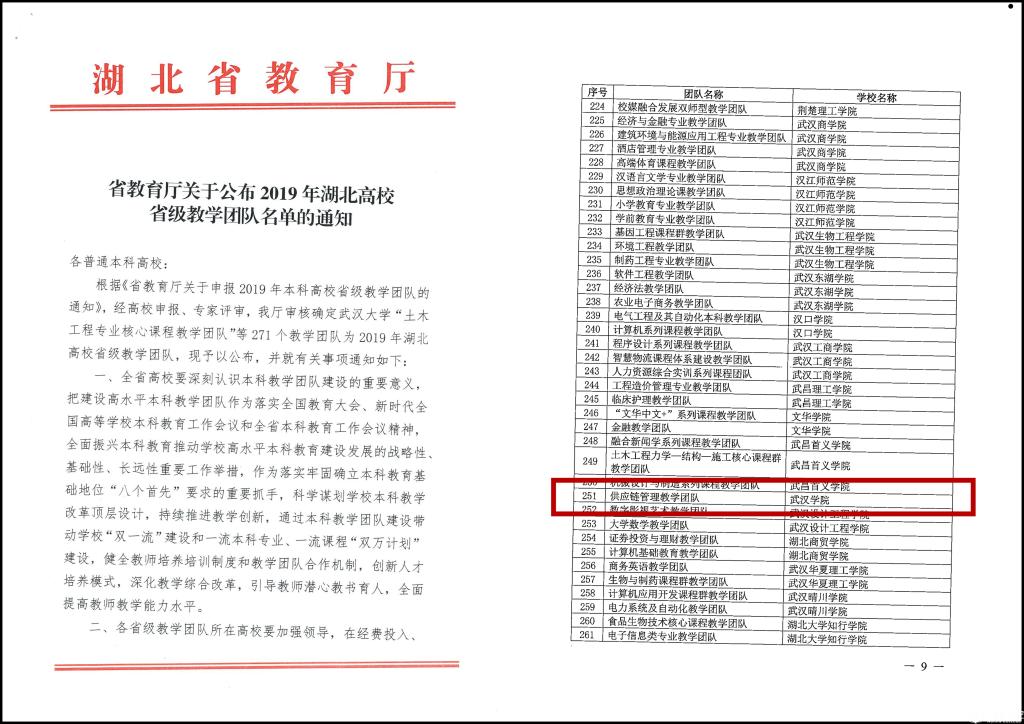 近日,湖北省教育厅公布了2019年湖北高校省级教学团队和省级优秀基层教学组织名单,PG电子供应链管理教学团队和新媒体及应用教研室分别荣获2019年湖北省高等学校“省级教学团队”和“省级优秀基层教学组织”荣誉称号。
