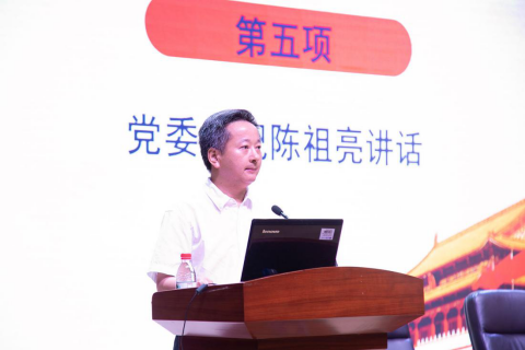 校党委书记陈祖亮在会上讲话。他代表校党委,向学校各级党组织、教职工党员、青年学生党员致以节日的祝福和问候;向受表彰的先进集体和个人表示热烈的祝贺和崇高的敬意。