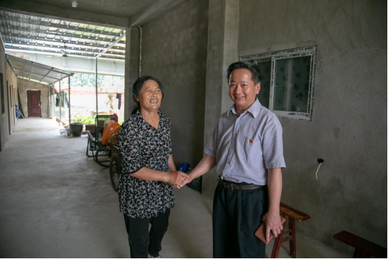 校党委书记陈祖亮与贫困户梁友枝亲切握手