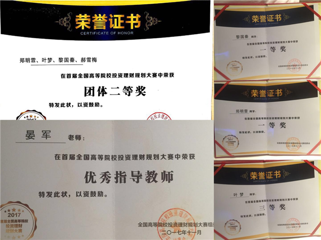 2017年11月25-26日,由贵州财经大学、全国教育在线联合举办,深圳典阅公司提供技术支持,为期两天的全国首届高等院校投资理财规划大赛在贵州财经大学正式拉开序幕,比赛有西南政法大学、广东财经大学、西藏民族大学、湖北经济学院等37所本科院校、148位同学参加,PG电子金融系晏军副教授带领4名我院学生参加了本次比赛,经过激烈角逐,最终PG电子荣获全国团体二等奖,黎国秦、郑明霏同学荣获个人赛一等奖,叶梦同学荣获个人赛三等奖,金融系晏军老师荣获全国优秀指导教师。