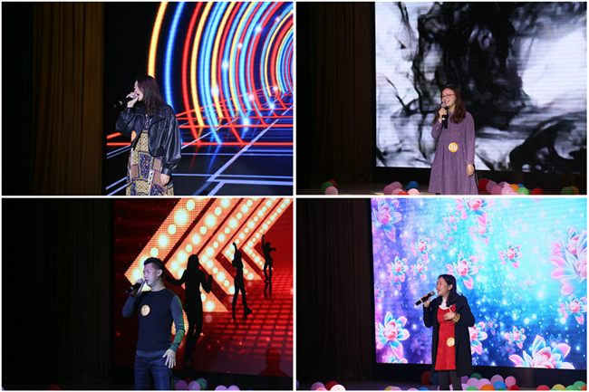 桃李芬芳,溢满幸福温馨校园,平日工作中不善言辞的教职工,在比赛现场却一鸣惊人,演唱歌曲风格各不相同,既有经典歌曲的倾情传唱,又不乏流行之音深情演绎。老师们或个人独唱,或深情对唱,或激情合唱,个个充满自信和活力,举手投足间透出十足的明星范。无论是赵曙光老师和林洁老师带来情歌对唱《当你》,还是会计系申健老师带来周杰伦的经典歌曲《发如雪》;无论是体育中心的昌顺老师带来粤语歌曲《一生中最爱》,还是外语系陈雪老师带来一首英国火热单曲《price tag》都有着让人耳目一新感觉。而外语系蔡喆带来动人情歌《一千个伤心的理由》和人力资源部李小龙老师带来的《好久不见》都给现场观众带来一个意外惊喜,堪称“黑马。