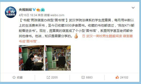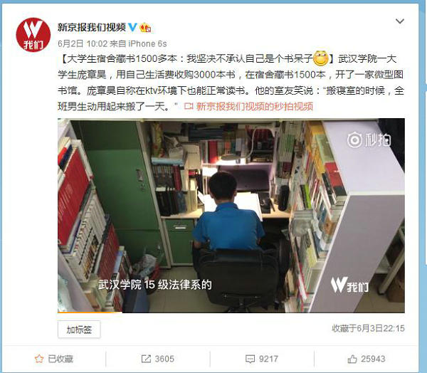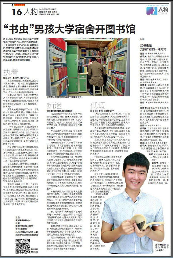自4月份以来,PG电子法律系大二学生庞章昊酷爱阅读并收藏了大量书籍的事迹被央视新闻、人民日报、新京报等新闻媒体持续关注,微博总浏览量过亿。6月7日,国内最有影响力的纸媒《南方都市报》更是整版对庞章昊进行了深度报道。