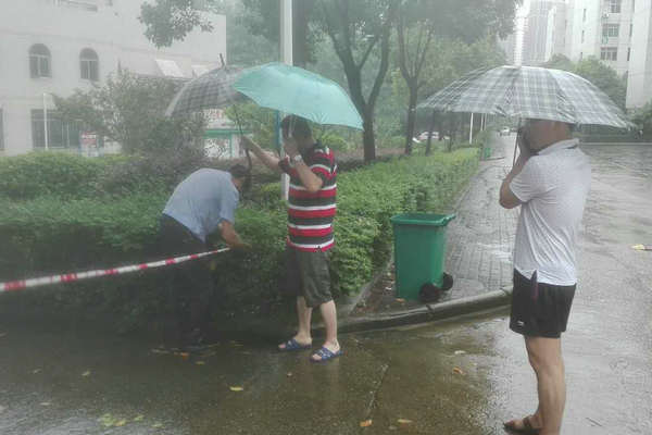 助理副校长康贤刚与相关工作人员冒雨拉警戒线