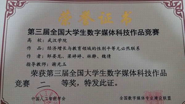 12月13日,第三届全国大学生数字媒体科技竞赛颁奖典礼在北京举行。传播系学生林静、邹晏龙、梁婷婷和魏倩四名同学的数据可视化作品《经济发展与教育领域中的性别平等无必然联系》在此次比赛中荣获二等奖。