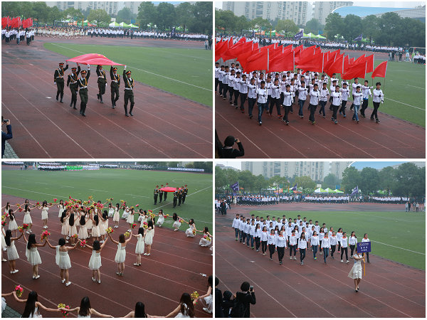 国旗、红旗、鲜花、学生裁判员方阵