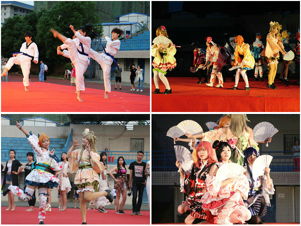 园游会开场的社团宝贝们一出场便赢得了众多学生的眼球,赞美声此起彼伏。街舞社带来的劲歌热舞《judas》,动感曼妙的舞姿引得观众们惊叫连连;up动漫社萌妹子们的舞蹈《辉夜姬和》更是牢牢锁住了在场观众的目光;而法律协会两位男生幽默风趣的唱歌方式更是赢得了地下观众的阵阵呼声。