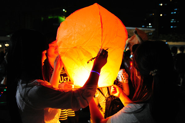 现场同学共同放飞孔明灯(拍摄:江禹)