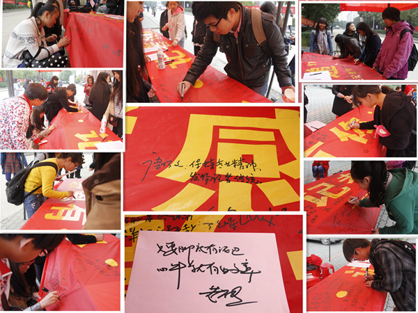 记者节期间,新闻传播系还在校内举行师生签名送祝福活动,来往师生纷纷送上对记者节的祝福。新闻传播系党总支副书记陈厚美在横幅上写到“放飞理想,共铸中国梦”,张学标教授专门为节日题词:“只要脚底有泥巴,心中就有好文章”。张学标老师解释道,“记者并不是坐在办公室里每天仅仅靠着电话采访的,而是要深入基层,走到社会生活中去,这样才能做好新闻。”