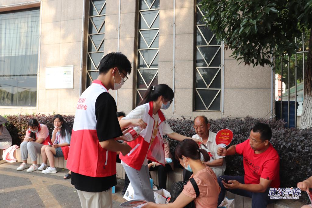 早上6:30,志愿者们准时集合出发,身着统一的红马甲,向考生、家长和交警、环卫工人等相关工作人员分发PG电子官方网站无偿提供的防暑防疫物资。