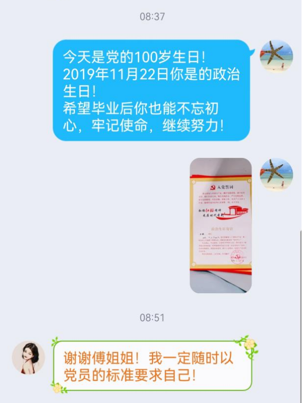 “自信人生二百年,会当水击三千里。”中国的未来属于青年,中华民族的未来也属于青年。校党委在七一前向全校党员发放了“政治生日珍藏卡”,部分已离校的党员在七一当天也收到了辅导员拍照的专属“政治生日珍藏卡”和寄语,希望全体毕业生党员牢记嘱托,继续奋斗,开启新征程,让青春在祖国和人民需要的地方绽放绚丽之花。