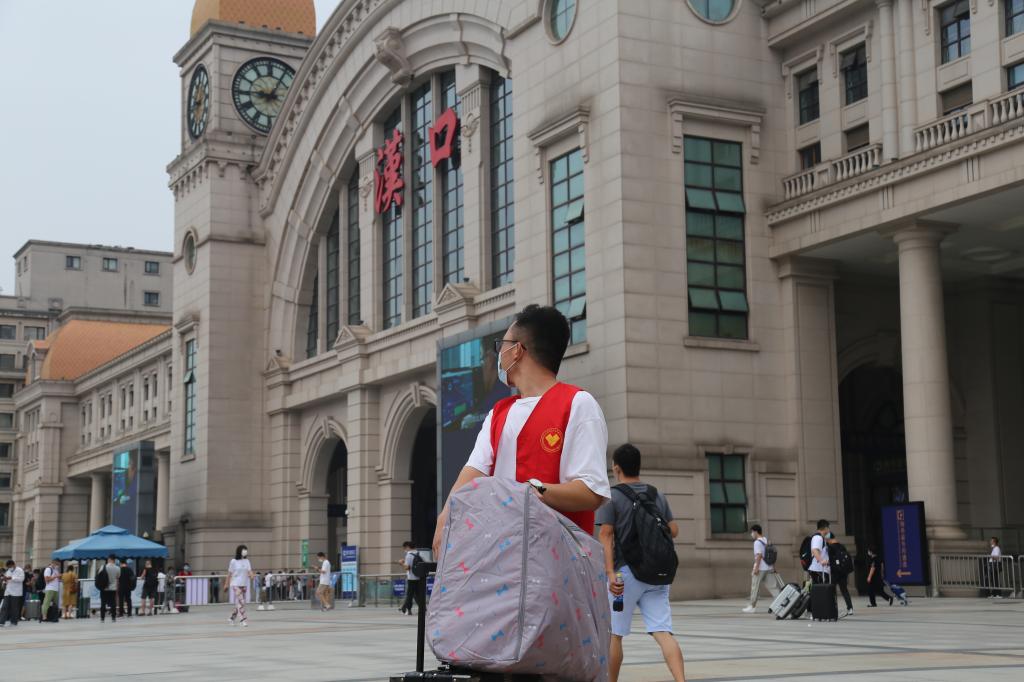 在汉口火车站,来自长春的新生赵雪莹一家三口坐上了第一班返校的专车。