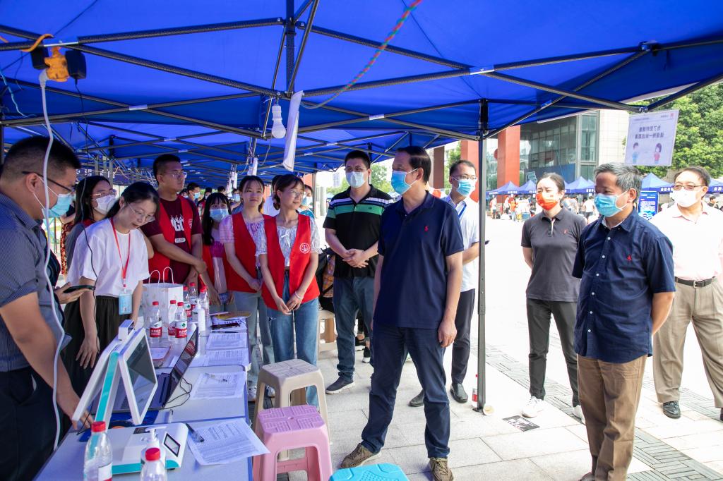 在迎新现场,校领导巡查各迎新点,了解新生报到情况,与新生、家长亲切交流,慰问迎新工作人员。