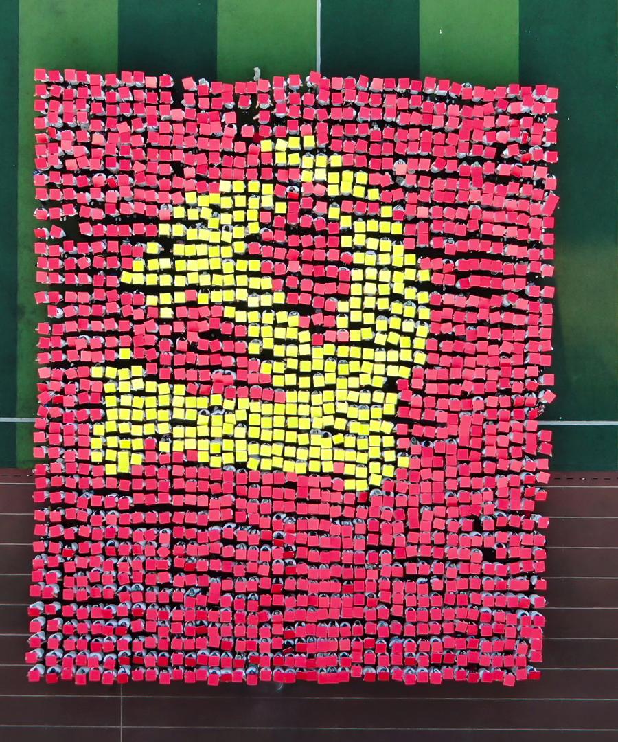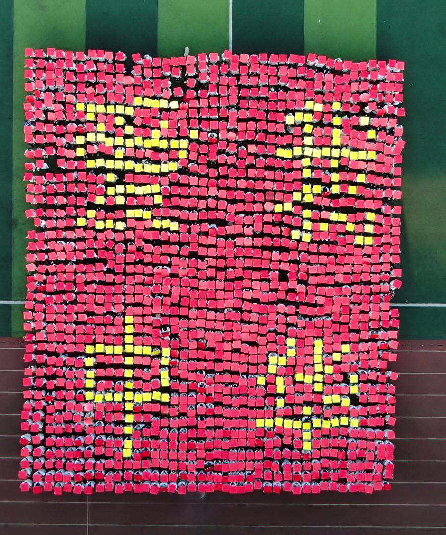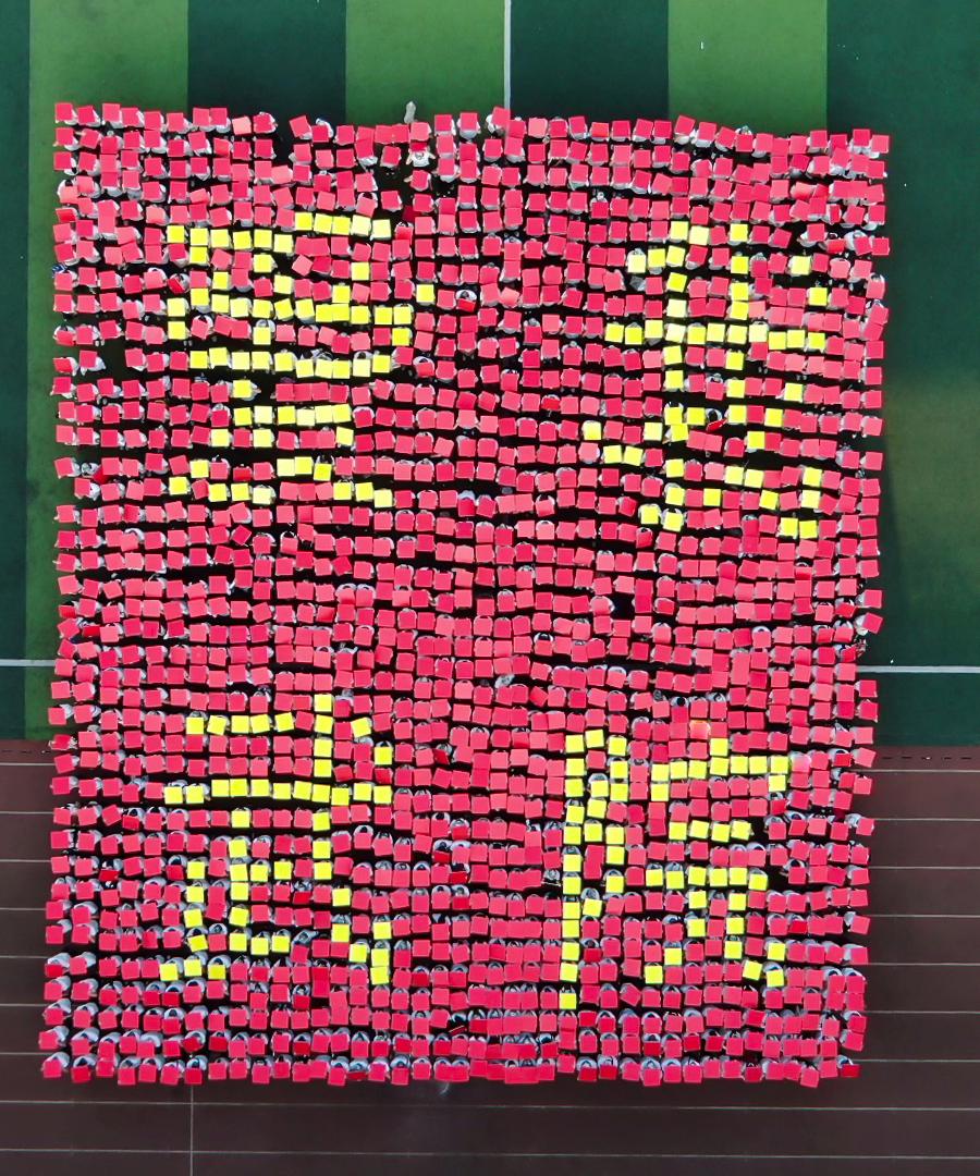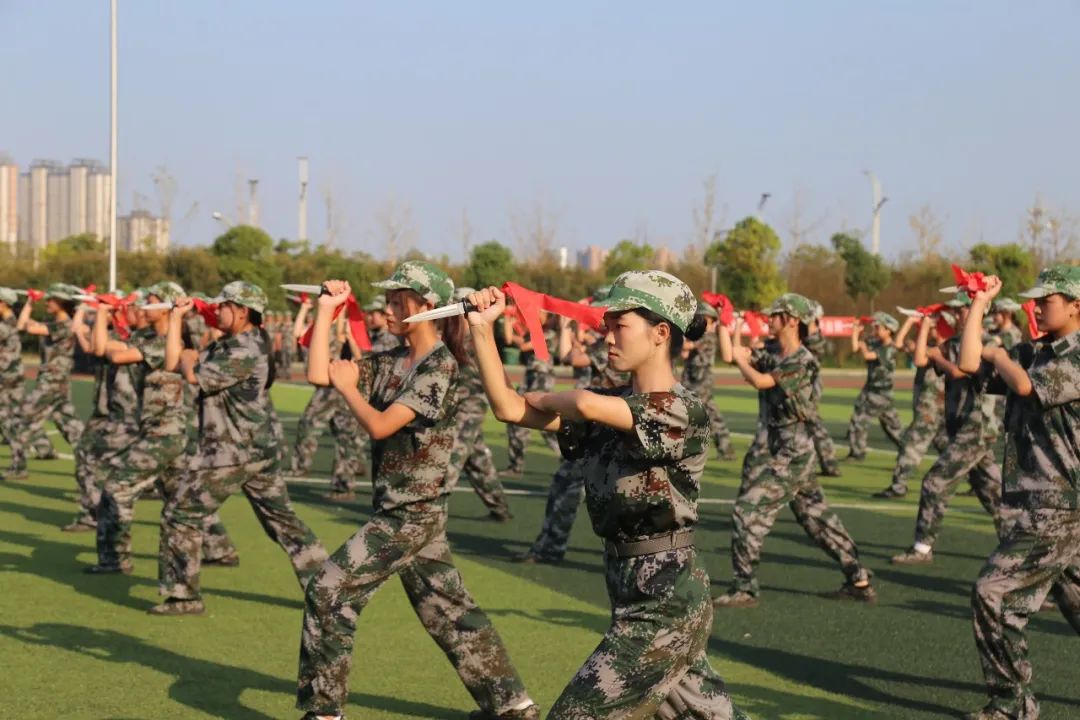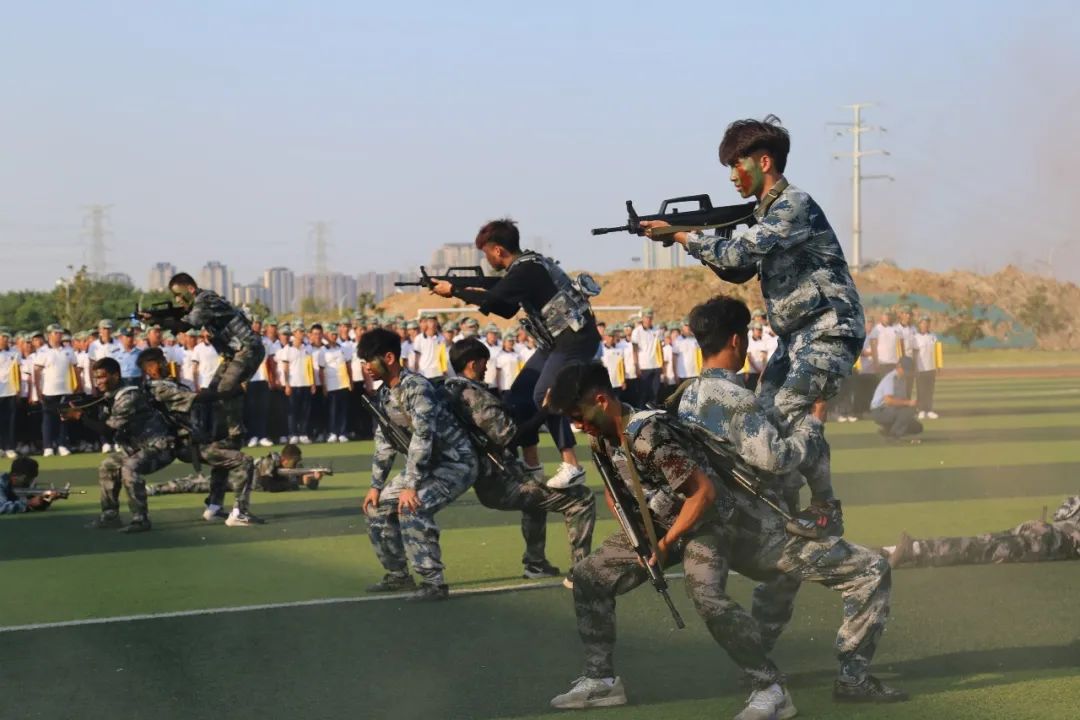 表演环节,分别进行了女子匕首操表演、男子捕俘拳表演、战术方队表演和花样方阵表演。其中花样表演方阵由1600名新生手持红黄两色泡沫板,变换出“1921-2021”、“100”、“学党史”、“悟思想”、“办实事”、“开新局”等字样,庆祝中国共产党成立100周年。
