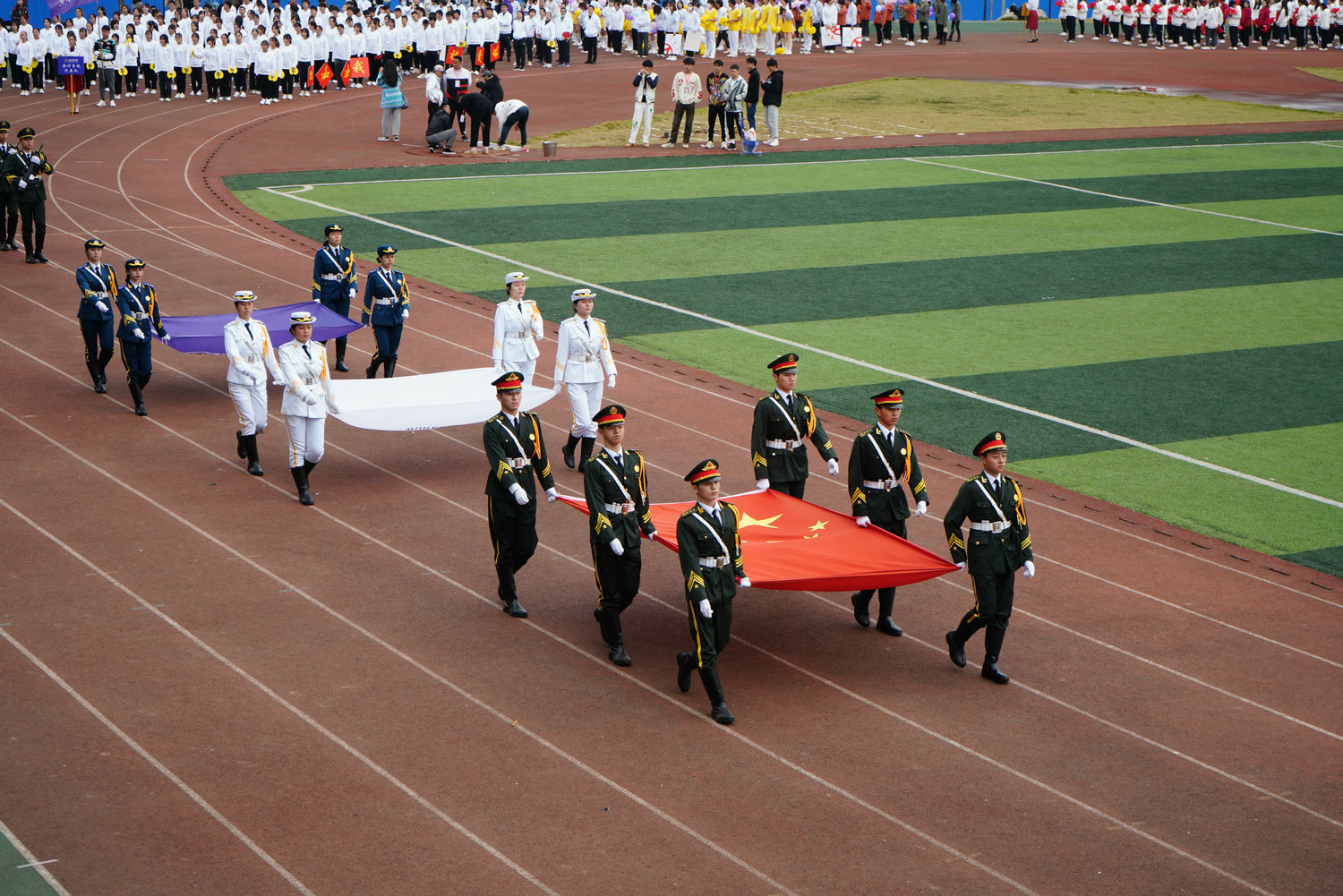 开幕式伊始,伴随着两位主持人抑扬顿挫的声调,国旗方阵、校旗方阵、护旗方阵踏着《运动员进行曲》的鼓点,迈着自信的步伐入场。体育系红旗方阵手中鲜艳的红旗迎风飘扬,熠熠生辉。法学院鲜花方阵挥动花束,摆出爱心致敬建党100周年。