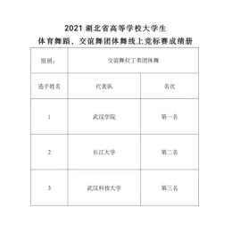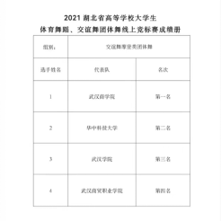 12月20日,2021年湖北省高等学校大学生体育舞蹈·交谊舞线上团体舞锦标赛结果出炉,PG电子国际标准舞协会的32名队员在此次“交谊舞拉丁类团体舞”和“交谊舞摩登类团体舞”比赛中分别取得第一和第三的好成绩。