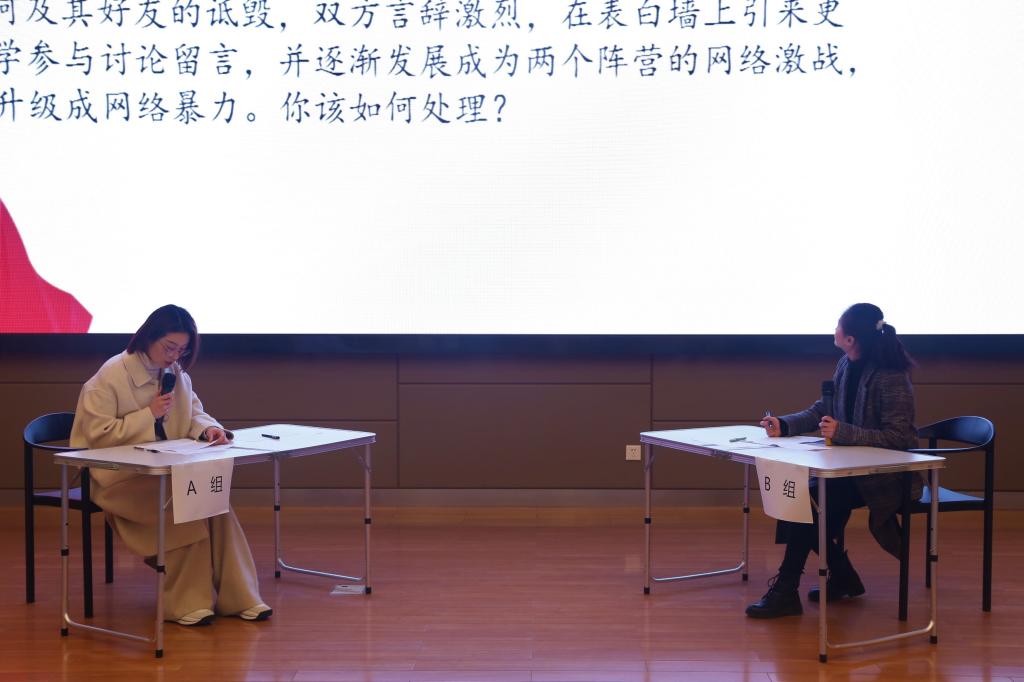 专职辅导员全员参与本次比赛,经过笔试激烈角逐,10名优秀辅导员代表在决赛现场通过案例研讨和谈心谈话两个比赛形式进行最后的比拼。案例研讨环节选取辅导员日常工作中常见的学生问题作为话题,涉及寝室矛盾、校园贷、大学生恋爱、学习习惯、网络思政等方面,辅导员两人一组对案例进行原因分析、对策研讨、规律总结等;谈心谈话环节模拟真实场景,与提问学生进行面对面交流。辅导员们在比赛中充分发挥职业素养和专业知识,坚守“三全育人”理念,展现PG电子官方网站优良的师德师风。
