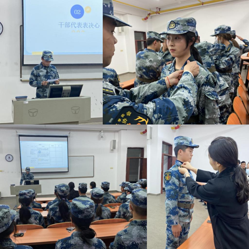仪式在铿锵有力的《当那一天来临》歌声中拉开帷幕。国防协会会长、信息工程学院学生孔令卿围绕军事训练、大项活动、国防教育、部门量化考核四个方面部署今年的工作。随后,协会军事与实践部部长和队员代表依次上台发言,他们用真挚的话语、坚定的眼神表达出对国防协会的热爱。授衔仪式环节,戚兰为会长佩戴专属徽章并为部长和队员授予新衔。