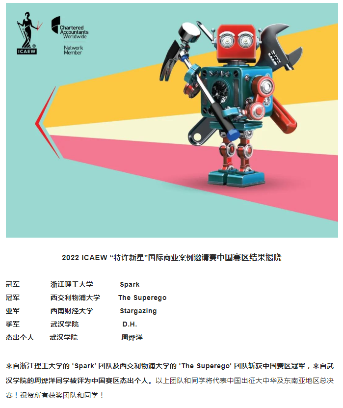 据悉,2022年ICAEW“特许新星”国际商业案例大赛由全球权威会计专业组织英格兰及威尔士特许会计师协会(ICAEW)发起,以培养国际化专业人才、促进创新实践能力为核心,赛事紧跟当下科学技术发展,聚焦大数据、人工智能等新兴科技与商业、财务实务的结合运用,鼓励学生拓展眼界、展望未来,为其提供一个与时俱进、学有所获的创新实践平台。参赛者不仅能够同全国各大高校的佼佼者同场竞技,将有机会与国际选手交流与比拼,获得名企实习、现金大奖、比赛荣誉证书等丰厚奖品!