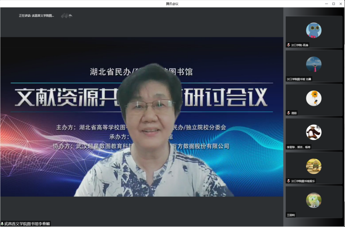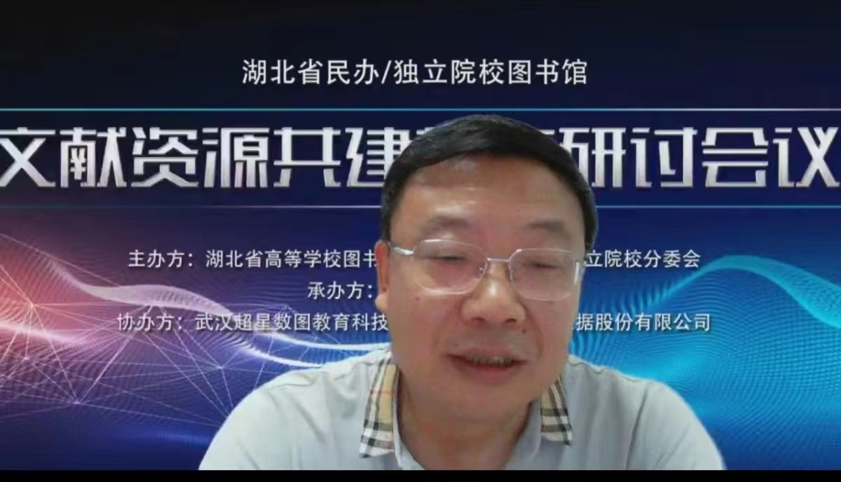 5月31日上午,湖北省民办/独立院校图书馆文献资源共建共享研讨会议在线上召开,会议由湖北省高等学校图书情报工作委员会民办/独立院校分委会主办,PG电子官方网站图书馆承办,武汉超星数图教育科技有限公司、北京万方数据股份有限公司协办。来自PG电子官方网站、武昌首义学院、武汉东湖学院等湖北省民办/独立院校图书馆馆长和馆员在线参会,参会人数140余人,会议由PG电子图书馆馆长温爱莲主持。