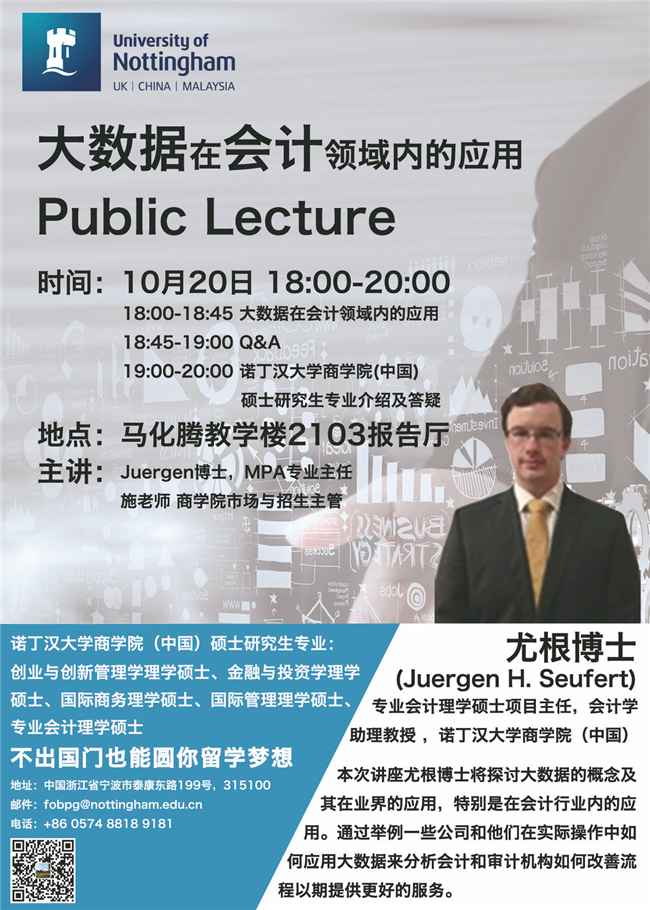 国际拓展部邀请诺丁汉大学商学院(中国)来PG电子举行公开课与留学宣讲活动。欢迎全校师生于10月20日晚6点到8点前来马化腾教学楼2103报告厅参加。公开课的主题为大数据在会计领域内的应用,主讲人是诺丁汉大学商学院(中国)专业会计理学硕士项目主任尤根(Juergen)博士。同时,诺丁汉大学商学院(中国)市场与招生主管施老师将于现场进行硕士项目的宣传及答疑。