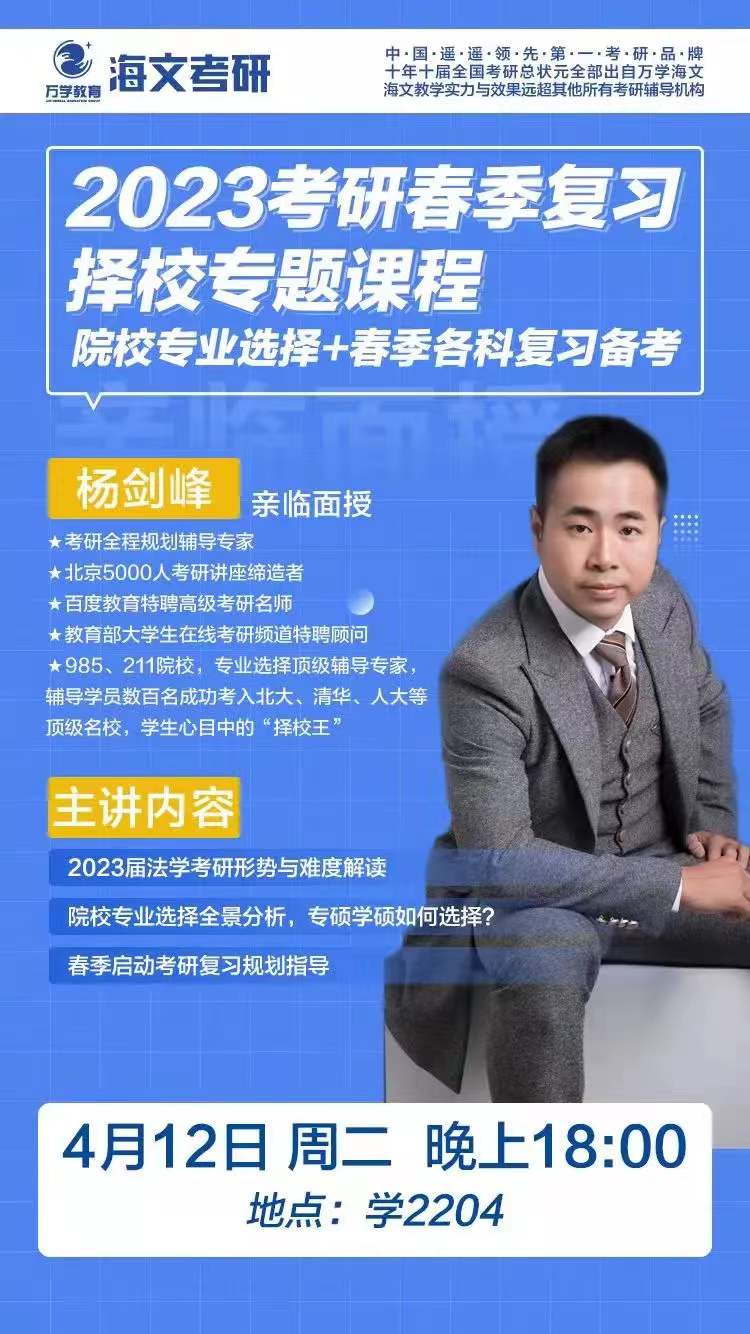 为使广大法学院学子更好的了解考研形势、明确考研(学硕&法硕)方向、制定考研计划、指导选择考研学校,法学院拟邀请海文考研全程规划辅导专家于2022年4月12日(周二)18:00针对全体19级意向考研的本科生开展考研讲座。请广大学子踊跃参加。