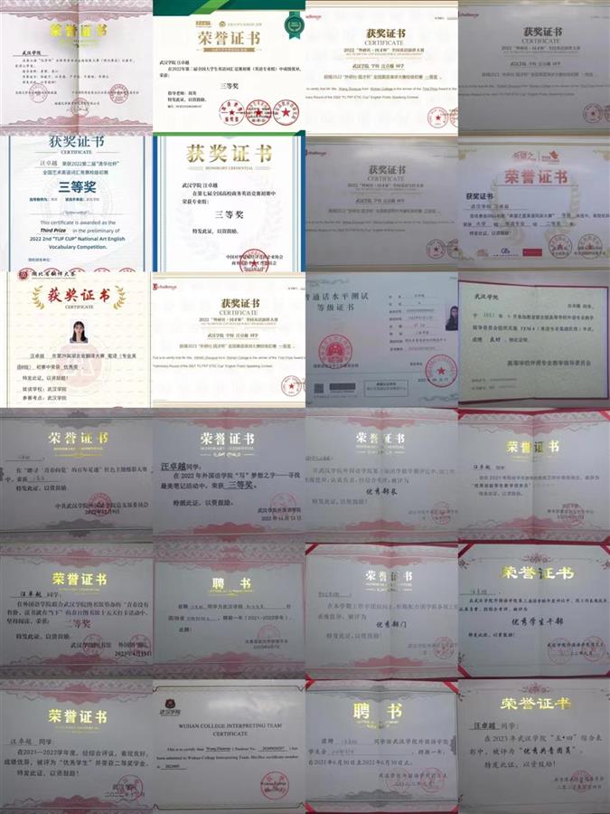 在校期间,汪卓越勤奋求学,大三学年平均分为89.14,多次斩获各类奖学金。与此同时,她活跃于各个赛场上,斩获了湖北省翻译大赛优胜奖、第二届全国大学生英语词汇竞赛省三等奖和第七届商务英语竞赛三等奖等诸多奖项。