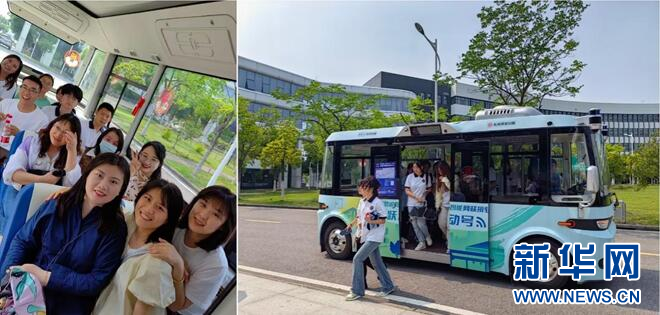 图为师生们体验SV-BUS试乘(拼版照片)