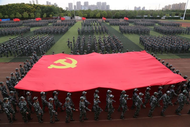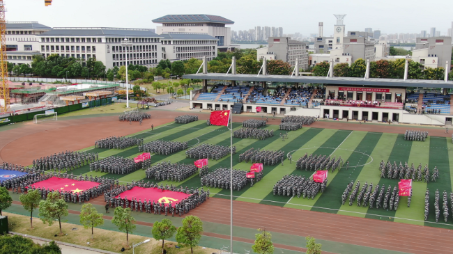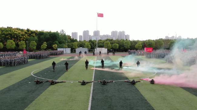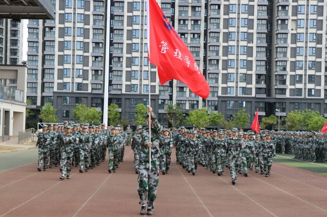 跟随着巨幅党旗、国旗和校旗,各学院方阵、连队依次走过观礼台,步伐整齐、口号嘹亮、军姿飒爽。