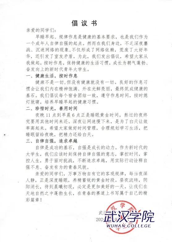 大学期间同学们不仅要学习知识,还须学会怎样科学高效管理自己的时间。早睡早起,有规律作息,看似小事,却足以磨砺意志,促使大家养成良好的学习、生活习惯。因此我们就健康作息提出以下倡议,并通过夜间网络降速、晨间起床号等措施,帮助同学们养成良好的作息习惯,为活力青春赋能。