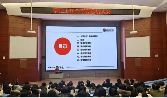 紧接着,2025年1月7日下午,学工战线教职员工齐聚中央教学楼2103教室,深入参与《学位法》的专题学习。教务处副处长谢忠琴担任此次主讲,她以详实的资料、清晰的脉络,详细阐述了《学位法》从孕育到诞生的制定背景、漫长且意义非凡的发展历程以及修订后的重大意义。她特别指出,自2025年1月1日起正式施行的《学位法》,是我国学位工作迈向法治化、规范化的重要里程碑,为我国学位工作提供了坚实的法治保障。她鼓励学工战线教职工不仅要自身深入钻研、吃透《学位法》的精神内涵,更要肩负起向学生广泛宣讲的重任,让《学位法》的理念深入人心。