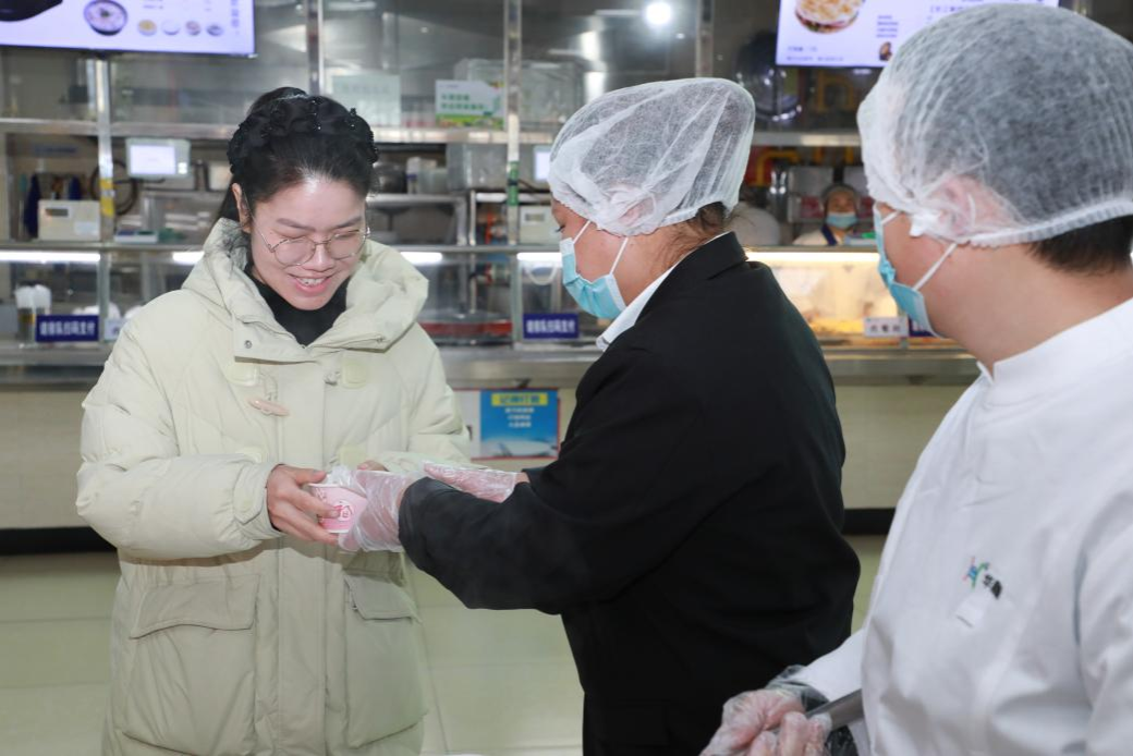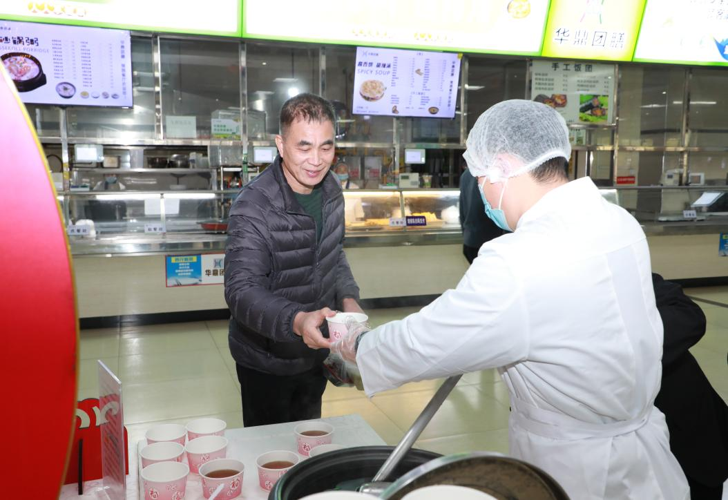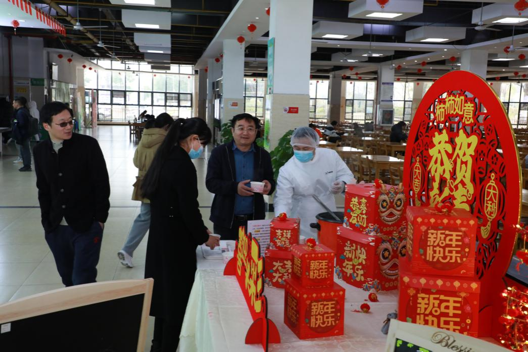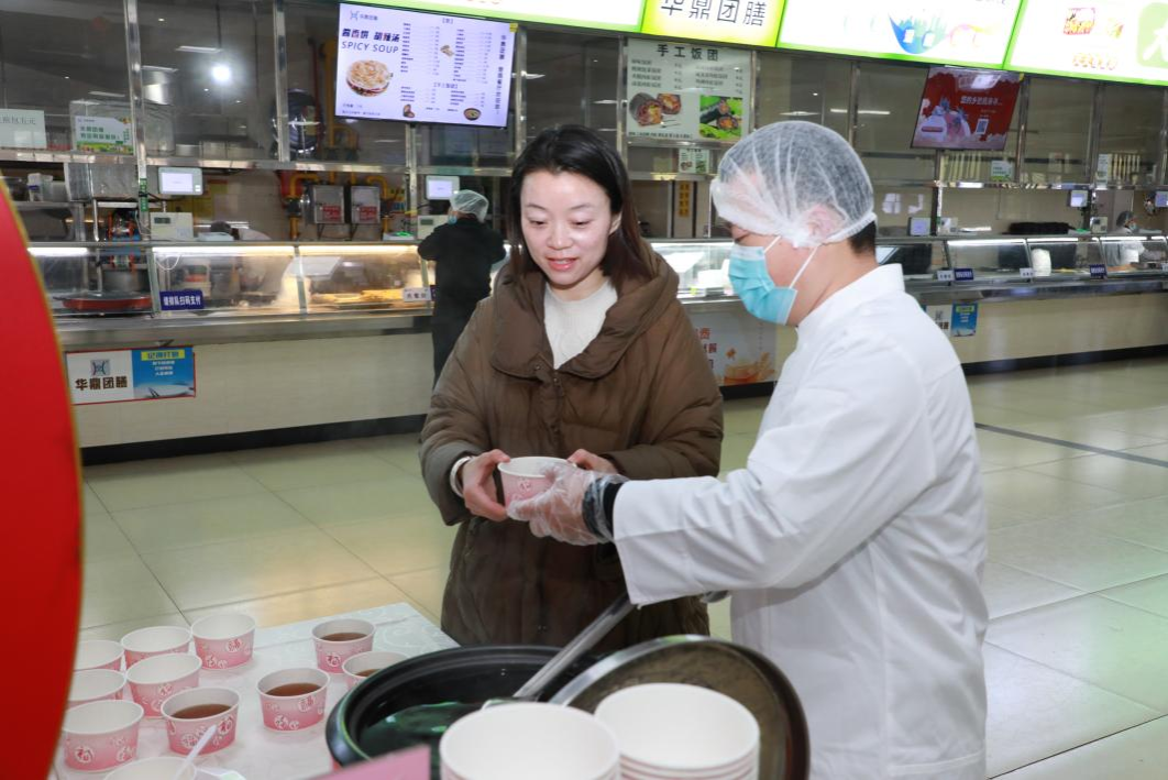 午餐时分,楚园食堂一楼的服务台前升起腾腾热气。在精心布置的新春装饰旁,整齐摆放着保温桶与小碗,并贴心标注着食材功效:“甘蔗生津润燥,马蹄清热润肺”。来往师生纷纷驻足,乘上一碗畅饮。“本来有点鼻塞,喝完整个人都通透了!”王同学捧着热气腾腾的糖水笑道。更有老师特意带着保温杯来装,“最近喉咙不舒服,下午工作时喝上一杯刚好润喉。”