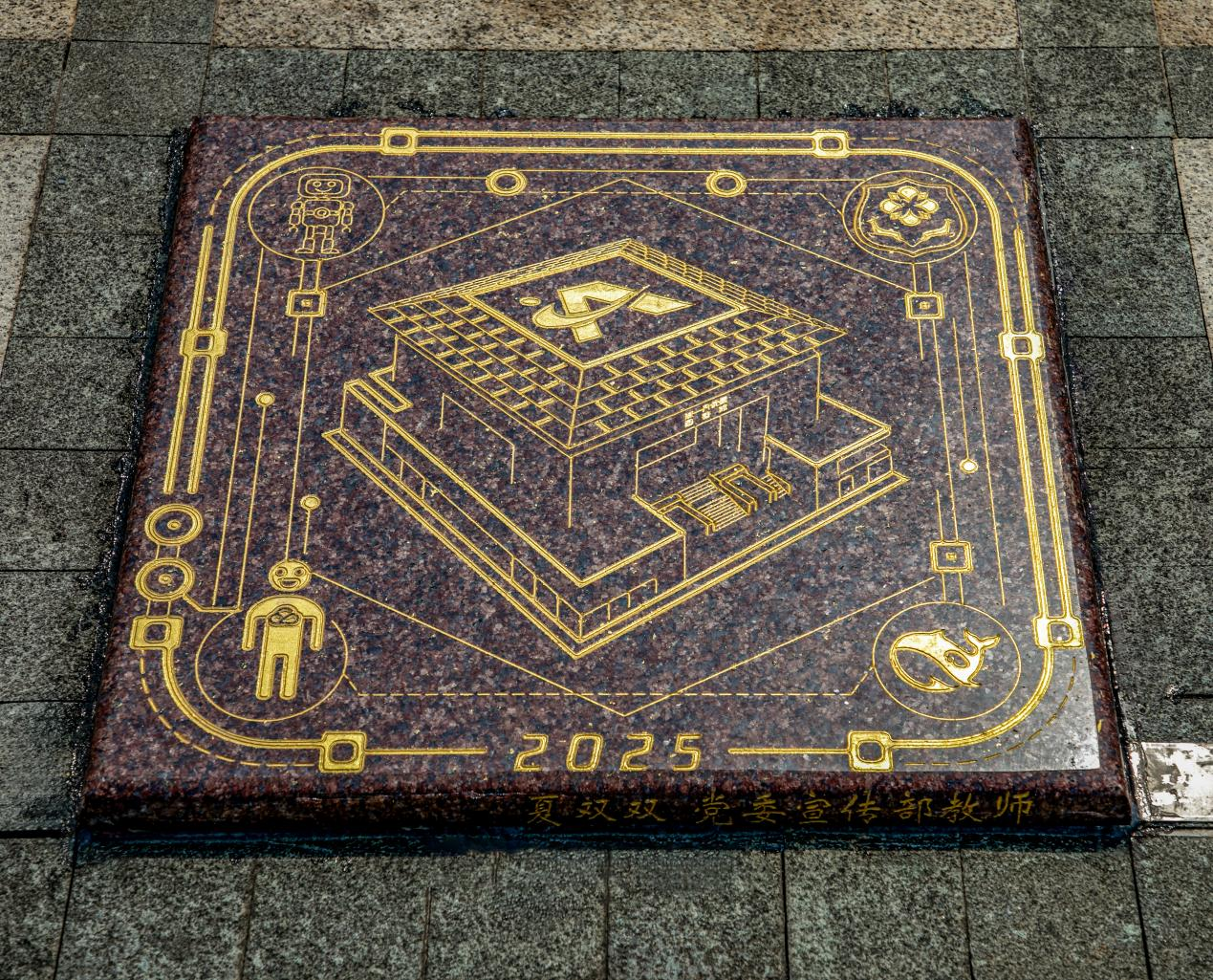 时间囊封盖图案面向全校师生征集评选,每年图案各有特色,蕴含着年度标志性元素。今年共有136幅投稿图案,最终入选的图案由学校党委宣传部教师夏双双设计。他介绍,图案以“智启时空·数聚未来”为核心理念,围绕2025年爆火的现象级AI技术热点,并使用了AI辅助设计工具。图案中央以“AI”字母构成冠冕,四角分别为人类、机器人、校徽、DeepSeek标识,寓意学校正将人工智能与教学科研深度融合,打造教育数智化优势。
