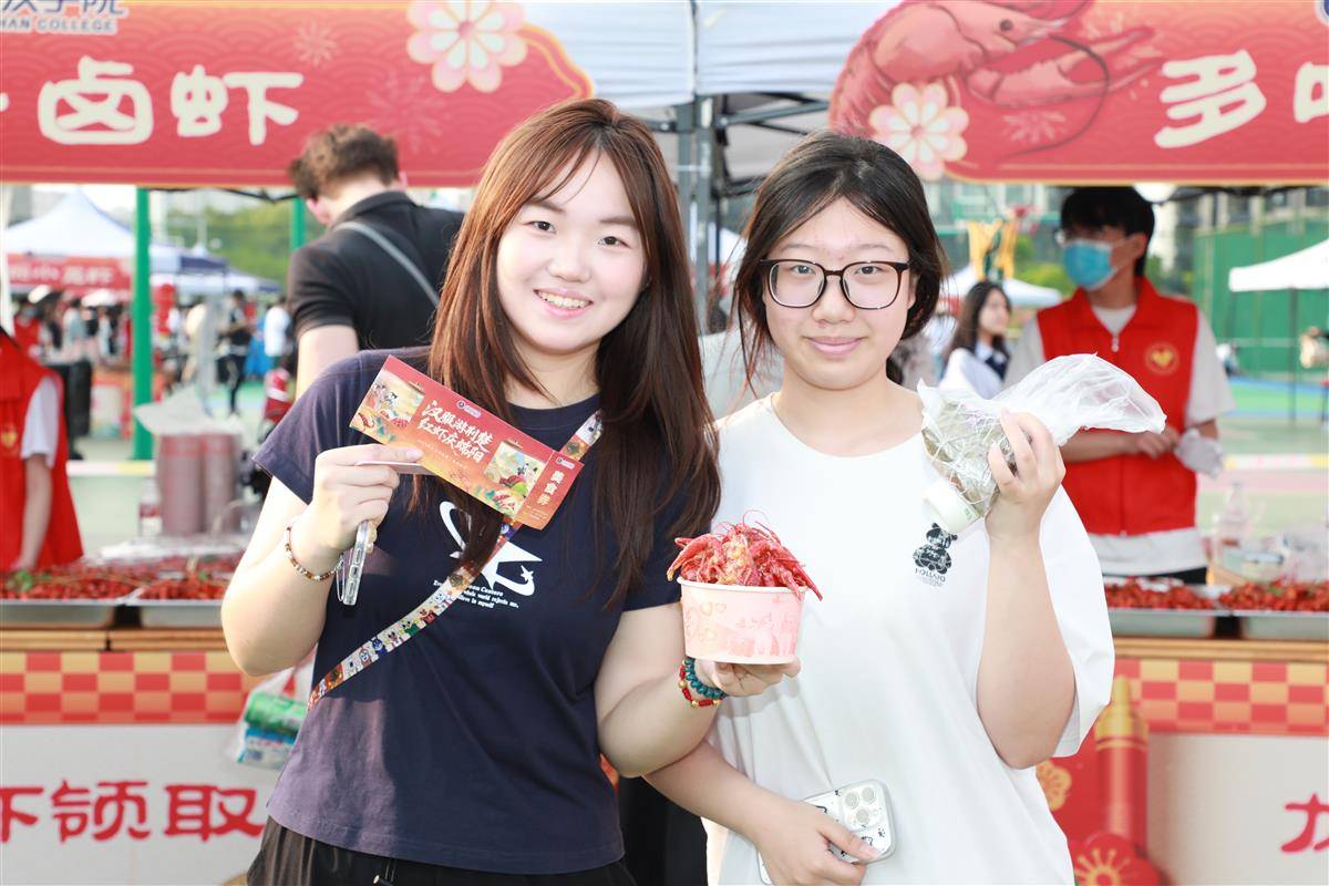 大二学生胡雪莹身着汉服,拍照打卡。“我是汉服爱好者,收藏了好多套汉服。得知这次龙虾节招募汉服大使,非常开心能有机会向师生们展示自己一直热爱的汉服文化。”她说,希望更多同学在快乐地“嗦”小龙虾的同时,能了解和喜爱汉服文化。