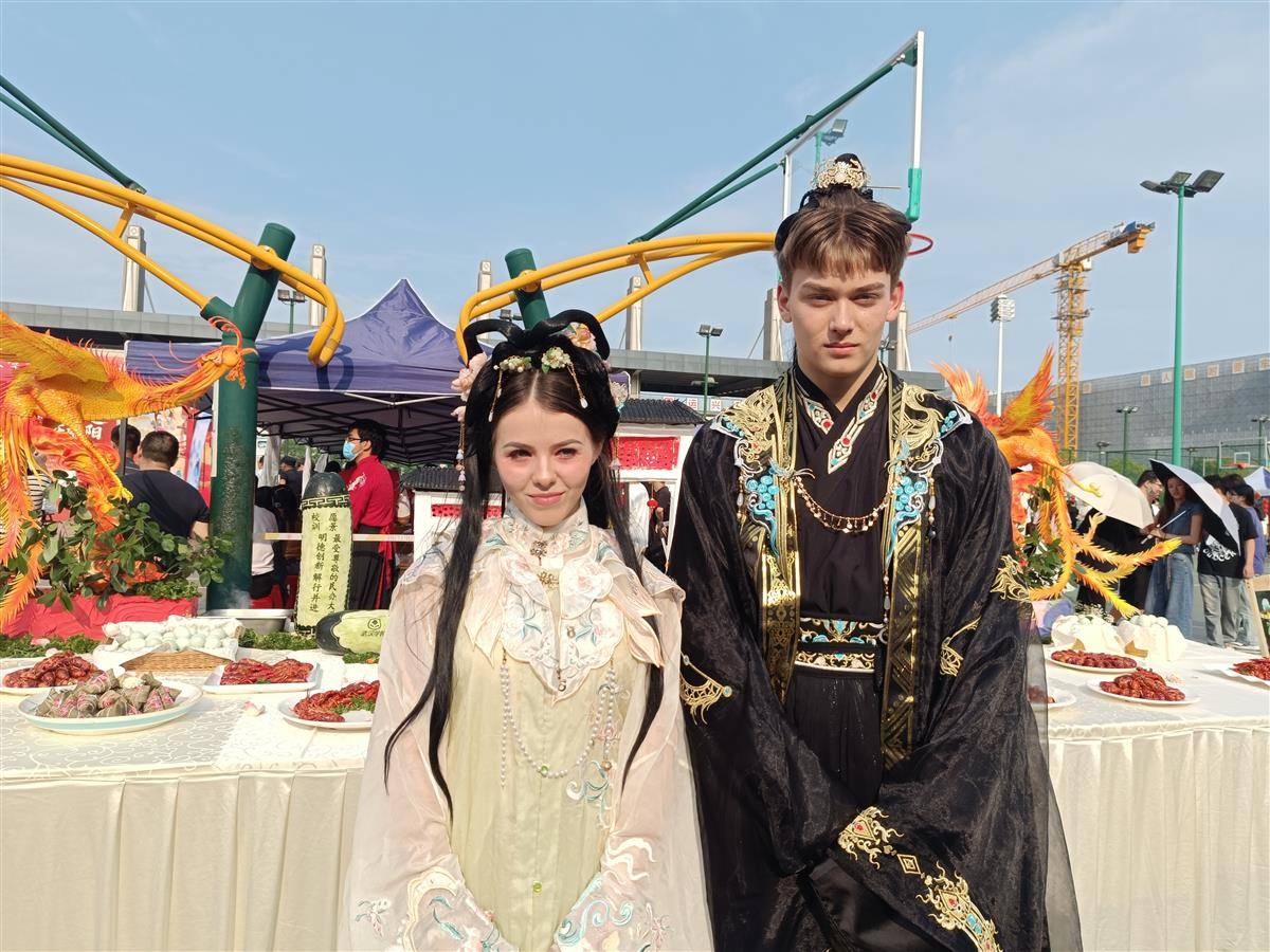 一些留学生也前来体验汉服文化和传统文化活动。来自哈萨克斯坦的留学生索菲亚、大卫身穿汉服品尝小龙虾,双双点赞:“好吃!”两人是该校财务管理大一学生,这是第一次吃小龙虾。索菲亚还开心地展示身上的汉服:“很漂亮!”