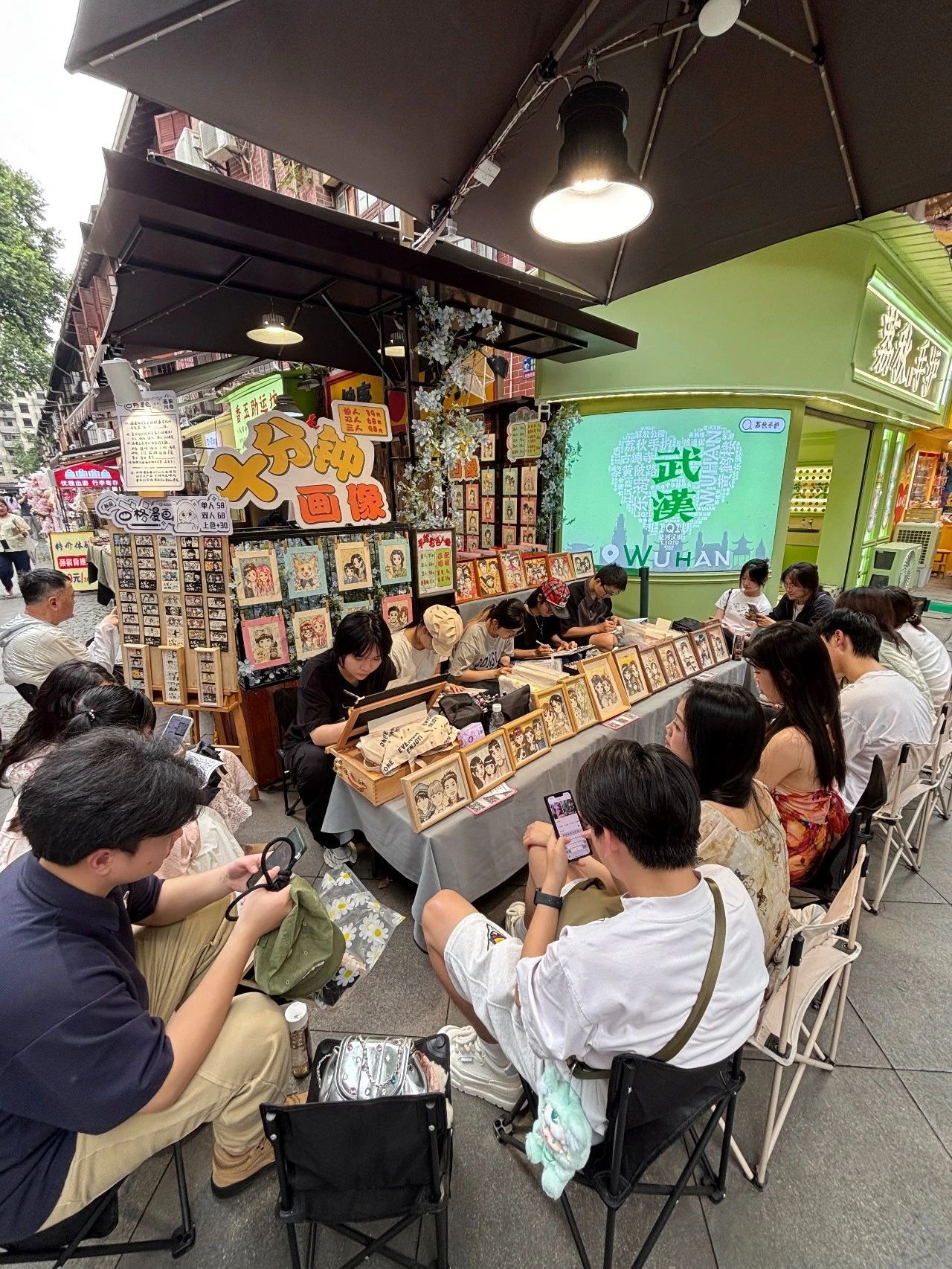 蒋天绮介绍,顾客以年轻人为主,情侣居多。她印象最深的是今年3月接待的一对异国恋情侣:男生专程飞到武汉与女友相聚,想用漫画记录在武汉的点滴。蒋天绮说:“我将巴公房子、东湖等景点融入画中。两人看到画时那种纯粹的开心和感动,我到现在都记得。”