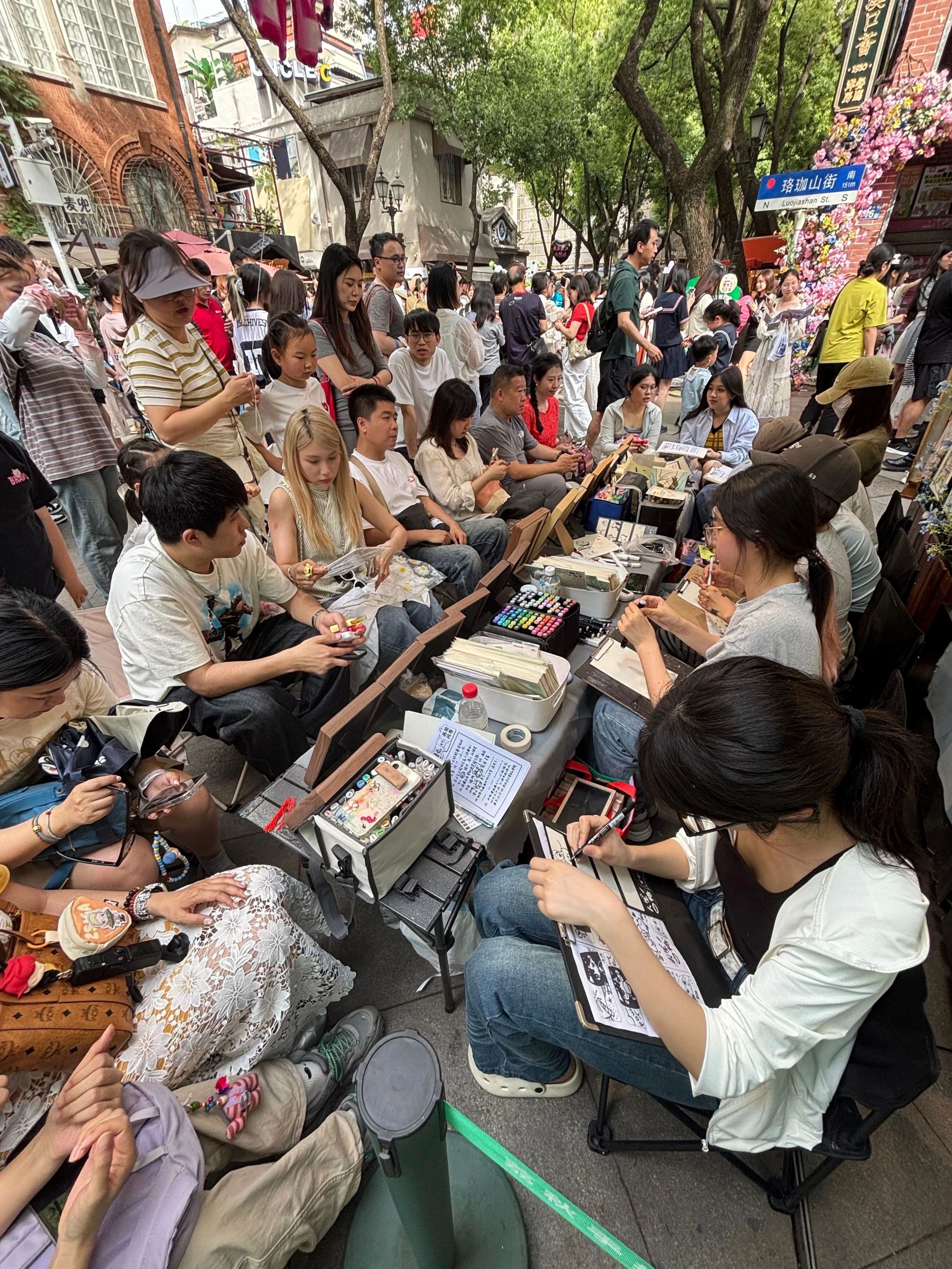 6月4日,长江日报记者在黎黄陂路街边摊位看到,画师王浩正为一对来自湖南岳阳的大学生室友创作漫画。其中一位男生说:“我们图的就是这份开心和纪念,照片给不了这种感觉。”