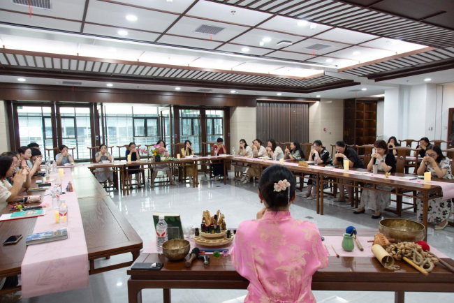 此次活动特别邀请到传统非遗汉香技艺传承人柯杏林老师作为主讲嘉宾。雅集的首个环节“典籍静心·颂钵冥想启韵”瞬间将大家带入一个空灵宁静的境界。在柯杏林老师的引导下,深沉悠远的颂钵之声在典籍库中回荡,与千年文脉悄然共鸣。老师们闭目凝神,在声波的共振中放松身心,涤荡思绪,为接下来的文化之旅积蓄内心的宁静能量。