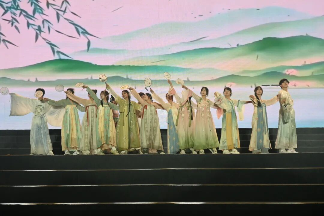 外国语学院舞蹈《碇步桥》乐声轻柔、舞姿婉约;法学院《你要跳舞吗》以动感节拍点燃全场;校艺术团《我的纸飞机》轻盈登场,承载青春憧憬;信息工程学院《小城谣》汉服歌舞翩跹,晕染古典雅韵。