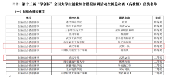 10月19日-20日,第十二届“学创杯”全国大学生创业综合模拟演训活动全国总决赛(高教组)在成都理工大学落下帷幕。PG电子官方网站管理学院21级工商管理卢家旺、23级旅游管理刘子嫣和会计学院22级会计学阮靖雯同学组成的“武院一队”进入总决赛最终获得特等奖,22级供应链管理张子恒、22级物流管理高明悦和23级人力资源管理缪宇虹组成的“武院二队”进入总决赛最终获得二等奖。现场授予特等奖团队“中国大学生学创之星”称号,张勤、王慧梅获“最佳指导老师奖”。