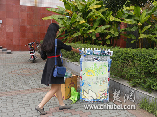 正在将垃圾扔到回收箱里的小方同学说:“这样别致的矿泉水瓶垃圾箱让我对喝完的塑料瓶归处有了思考,我们学生本身就是饮料消费的主要支持者,以后大家能随手环保啦!”