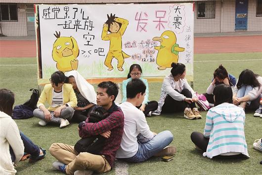 近五十学子参赛(如图),可半小时后只剩下三人。其中两名男同学低头闭眼,呈冥想状,另一名女生则偏着头直视远方。40多分钟后,围观的同学开始干扰他们:有的讲笑话,有的起哄,有的做偷吻状各出奇招,最终法律系的陈强挺过1小时夺冠。