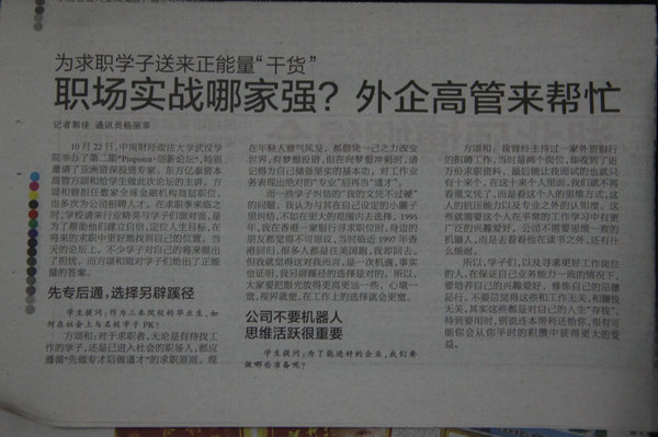 方颂和:我曾经主持过一家外资银行的招聘工作,当时是两个岗位,却收到了近万份求职资料,最后能让我面试的也就只有十来个。在这十来个人里面,我们就不再看重文凭了,而是看这个人的思维方式,这人的抗压能力以及专业之外的认知度。这些就需要这个人在平常的工作学习中有更广泛的兴趣爱好。公司不需要思维一致的机器人,而是去看看他在读书之外,还有什么能耐。